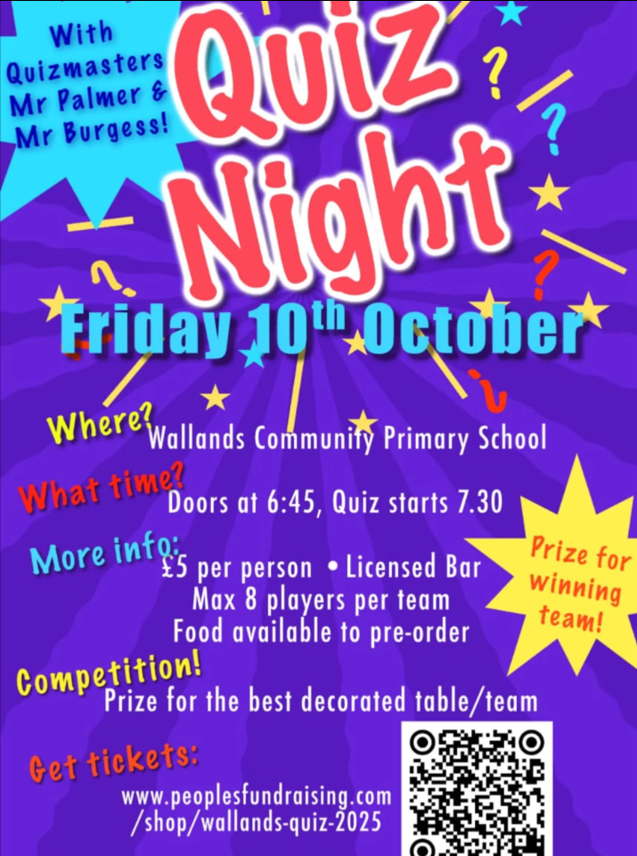 Wallands QUIZ Night is back by popular demand with Ben and Mr Palmer as our quiz masters. Come and join us for an evening of fun on *Friday 10th October.* Doors open from 6.45 when you can enjoy chicken or falafel gyros cooked by chef Nancy and drinks from the licensed bar. Use this link to get your tickets and pre-order your food. https://www.peoplesfundraising.com/shop/wallands-quiz-2025