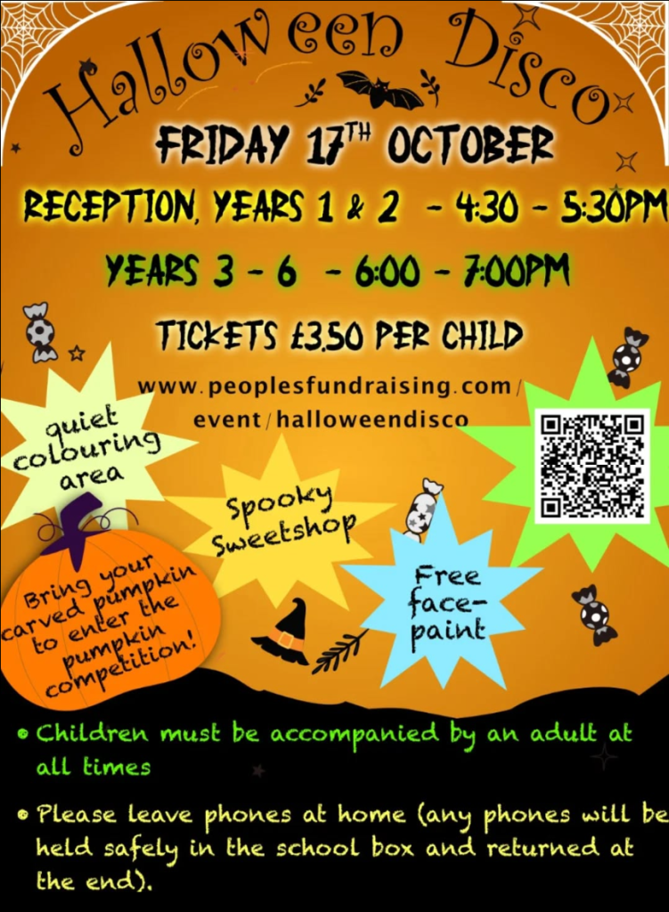 All children must be accompanied by an adult. Don’t forget to enter into our carved pumpkin competition. Bring them along on the night and we will provide the lights. Enjoy baking? Can you bake some cakes for us to sell at the tuck shop? Bring them along to the office on the Friday with a list of ingredients. Please no nuts including coconut. There may be some allergens so please make the volunteers aware of your child’s allergies. Follow this link to get your tickets. Please make sure to fill in the questionnaire to give the names of who is coming. https://www.peoplesfundraising.com/event/halloween-disco-friday-18th 🎃🎃