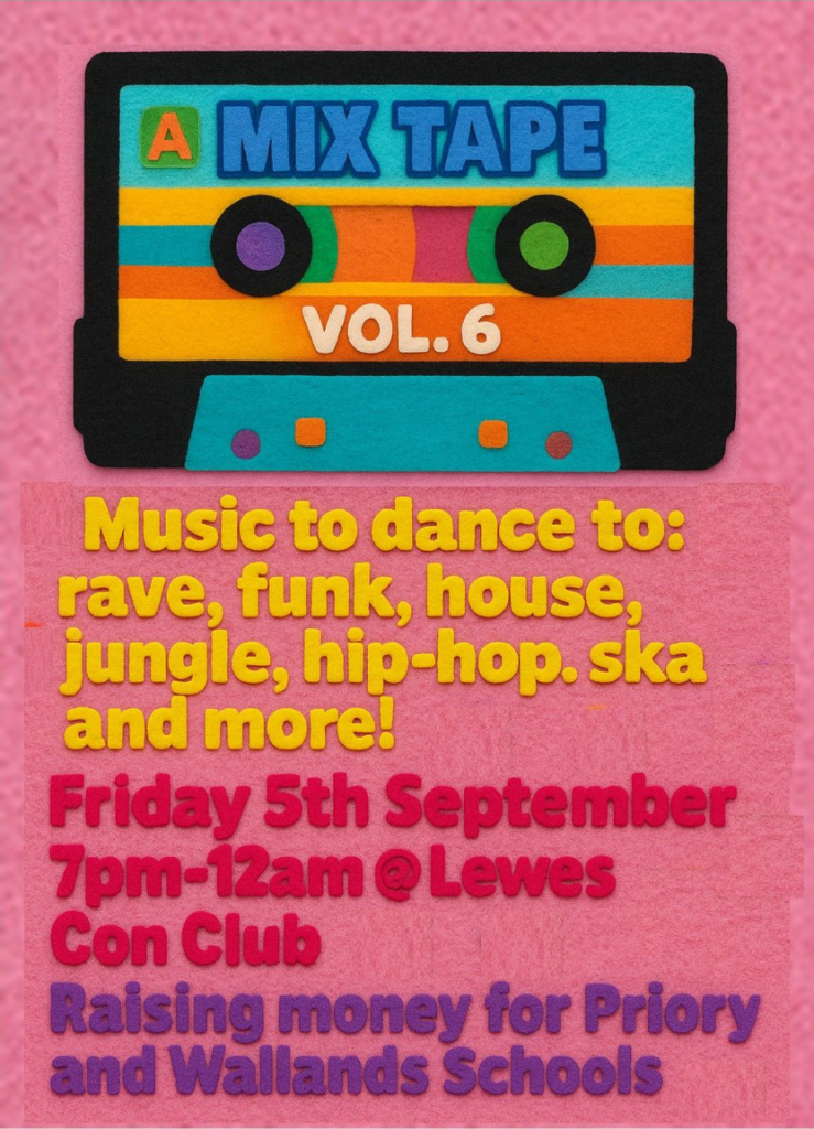 Not long until Mix Tape returns to Lewes Con Club. Get your tickets here to raise money for Wallands and Priory School. Expect an evening of nostalgic and new beats to dance to, funk, hip hop, house, garage, jungle and rave https://fows.charityhive.co.uk/tickets/19/mix-tape-volume-4 raise money for Wallands and https://go.rallyup.com/mixtape4/Campaign/Details for Priory